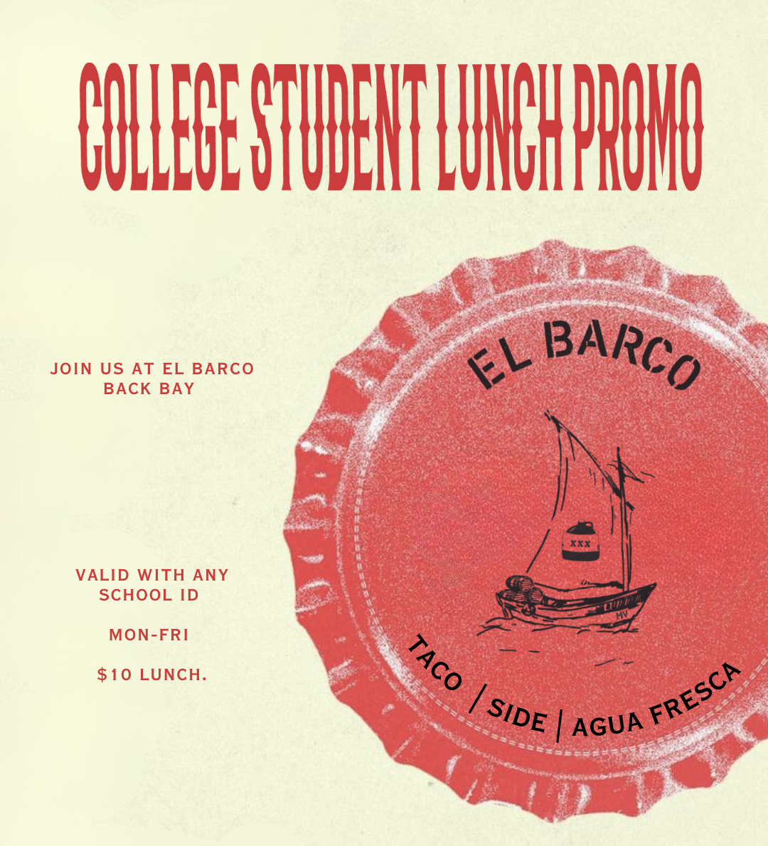 Hey college students! Looking for a delicious and affordable lunch deal? Swing by El Barco Monday through Friday, 11:30am - 4:00pm and enjoy our special $10 College Student Lunch Deal! Treat yourself to a mouthwatering taco, refreshing agua fresca, and a tasty side dish. It's the perfect way to refuel and recharge during your busy day on campus. Don't miss out on this fantastic offer - come by and savor a satisfying meal that won't break the bank!